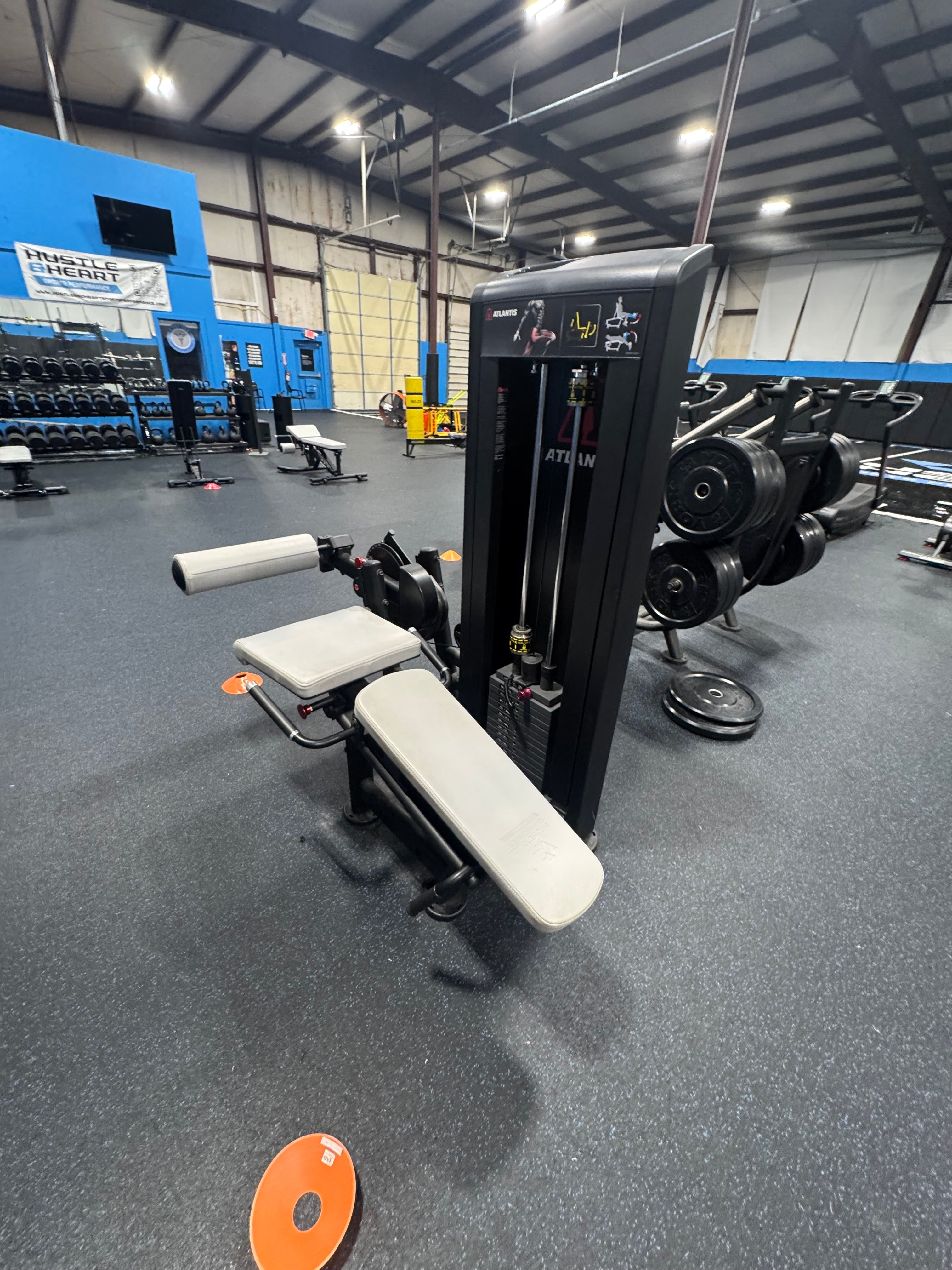- Pull-pin drops backrest into flat position for lying leg curls.