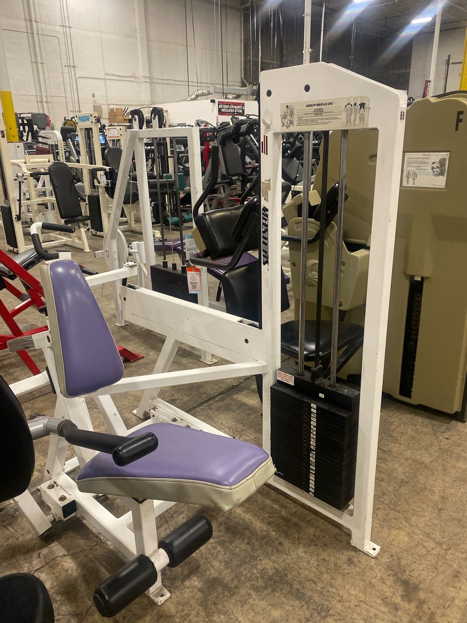 Body Masters 213 Rowing. weight stack of 250 lbs. in 20 lbs. increments starting at 20 lbs. It has a pulley system that runs via a Kevlar belt. There is an